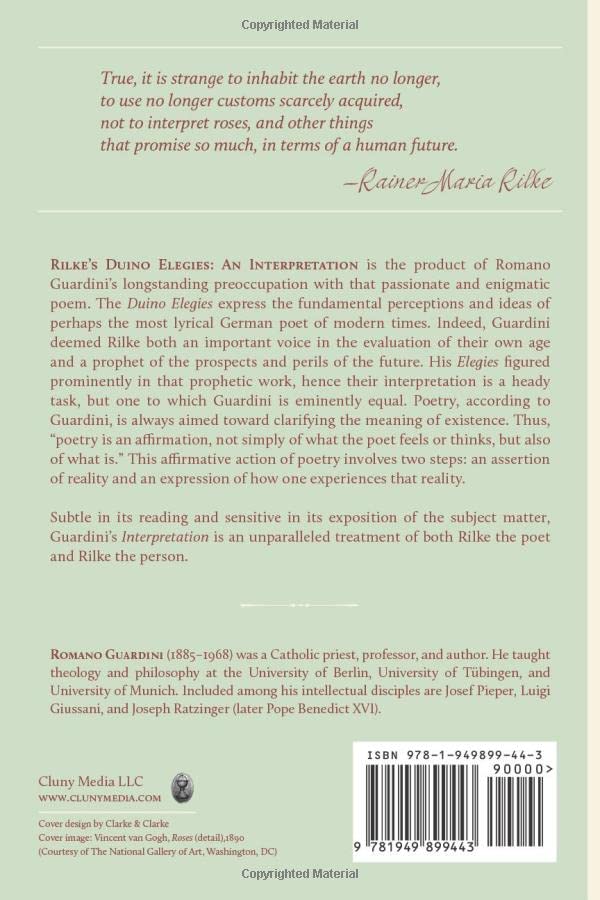 Details: Rilke’s Duino Elegies: An Interpretation is the product of Romano Guardini’s longstanding preoccupation with that passionate and enigmatic poem. The Duino Elegies express the fundamental perceptions and ideas of perhaps the most lyrical German poet of modern times. Indeed, Guardini deemed Rilke both an important voice in the evaluation of their own age and a prophet of the prospects and perils of the future. His Elegies figured prominently in that prophetic work, hence their interpretation is a heady task, but one to which Guardini is eminently equal. Poetry, according to Guardini, is always aimed toward clarifying the meaning of existence. Thus, “poetry is an affirmation, not simply of what the poet feels or thinks, but also of what is.” This affirmative action of poetry involves two steps: an assertion of reality and an expression of how one experiences that reality. Subtle in its reading and sensitive in its exposition of the subject matter, Guardini’s Interpretation is an unparalleled treatment of both Rilke the poet and Rilke the person.